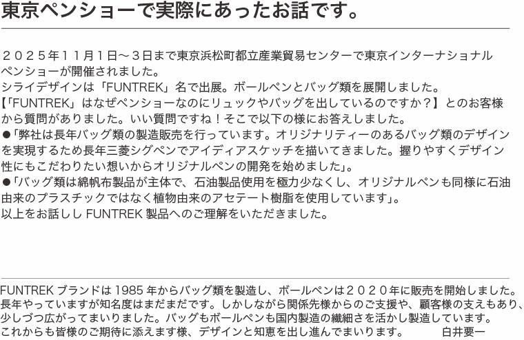 We are product designers who love trekking. Our brand is FUNTREK. Taking advantage of domestic manufacturing techniques, we manufacture bags from canvas material that ages beautifully and has a low environmental impact. We have received 40 Good Design Awards to date, and have also designed Nikon camera bags. We design and manufacture with the concept of enjoying walking. We accept bag design and manufacturing. Please remember the FUNTREK brand.